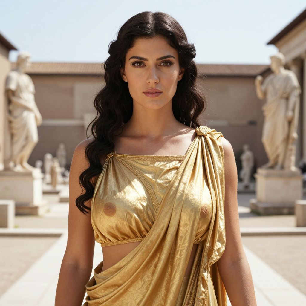 Photograph of a beautiful woman with long, wavy black hair, wearing a gold, one-shoulder, draped dress that reveals her right breast and nipple. Her dark eyes are focused directly at the camera, and she has a neutral expression. She stands in a sunlit courtyard with classical statues in the background, including two white marble figures on either side. The courtyard has a stone pathway and the sky is clear. The image has a slightly surreal, high-contrast style, emphasizing the gold fabric's texture and her smooth, tan skin.