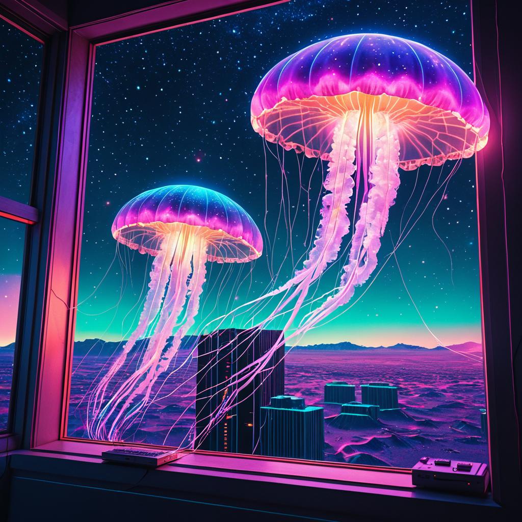 Neon-lit dancer performing under flickering street lamps, retro future city outside a window, vaporwave wallpaper, vivid sunset, dreamy, extremely detailed, ultra-high resolution, rendered in Unreal Engine