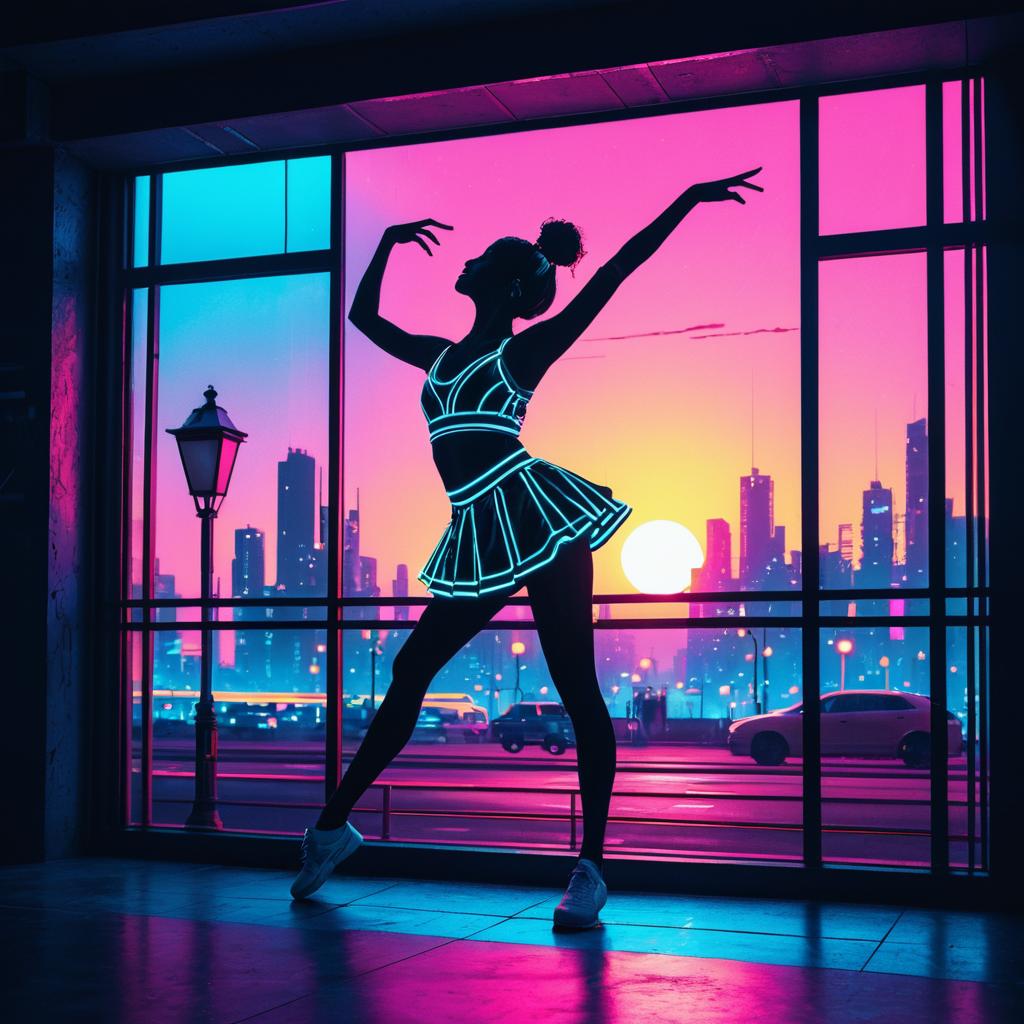 Silhouette of a dancer wearing a glowing neon outfit performing inside a room with large windows. Outside is a retro-futuristic city illuminated with vibrant neon lights and a vivid sunset sky. The scene features a vaporwave aesthetic with ultra-high resolution detailing and dynamic lighting.