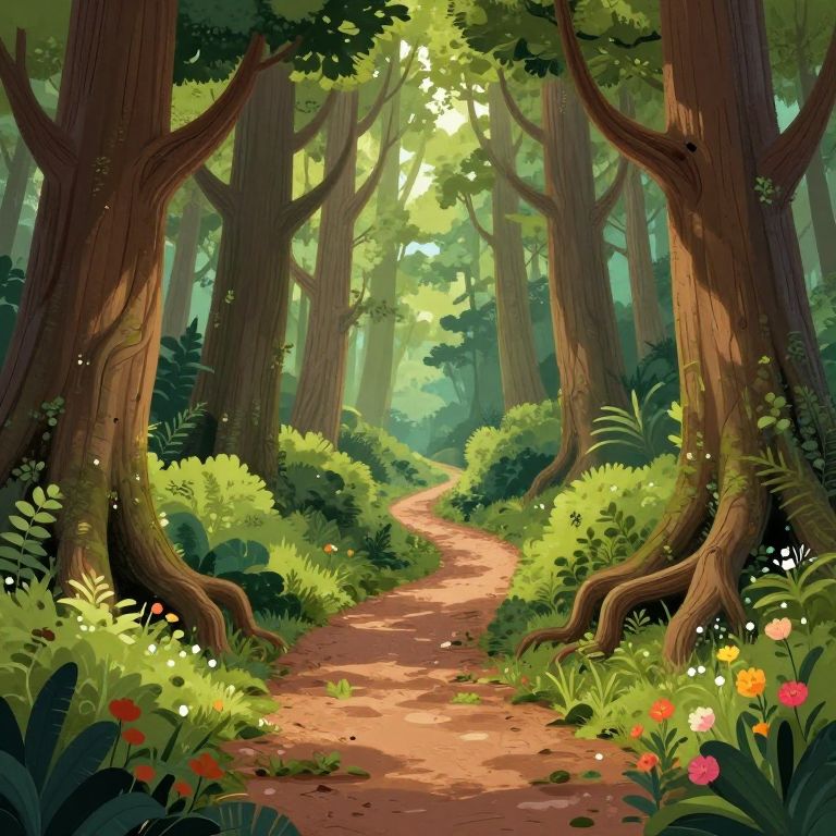 The image is a vector illustration with a limited color palette, featuring a serene forest scene. The composition is minimalist, with clean lines and simple shapes. The foreground is dominated by large, white flowers with delicate petals, arranged in a symmetrical pattern. The background reveals a winding river, flanked by lush green foliage and tall trees with dark trunks. The overall scene is tranquil and peaceful, with a sense of depth created by the layered elements. The illustration is reminiscent of a side-scrolling platformer game, with a focus on simplicity and natural beauty.