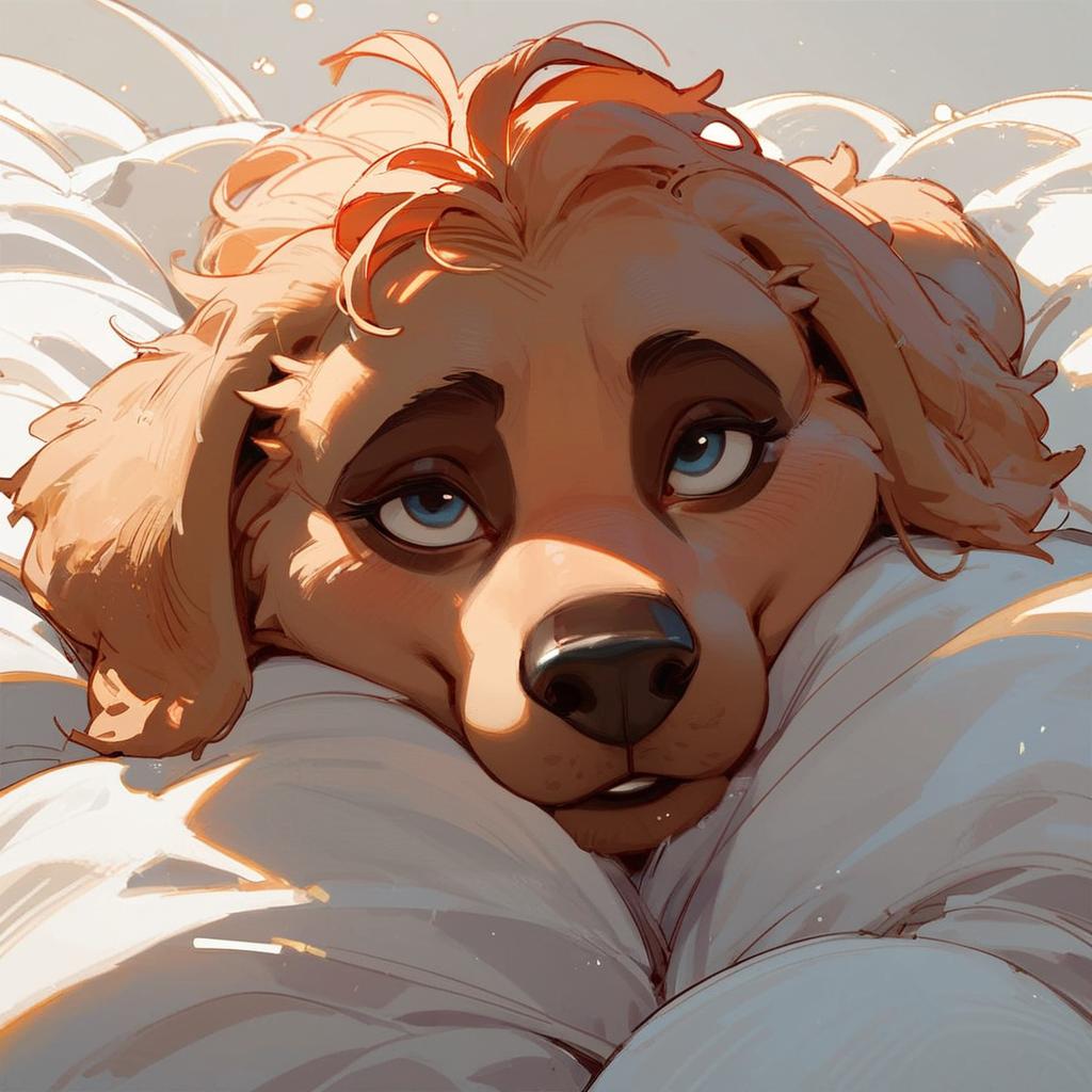 Digital illustration of a sad-looking animated puppy with expressive blue eyes resting its head on a soft, white surface. The dog has golden fur with slightly tousled hair, drawn in a Disney-inspired style.