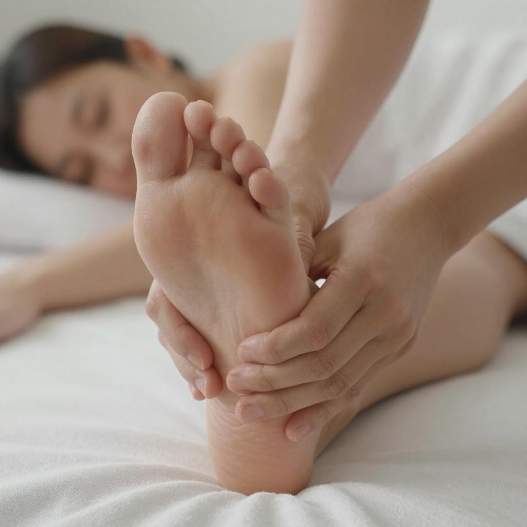 Photograph of a close-up shot taken from a low angle, showing a pair of hands gently massaging the sole of a person's foot. The person's skin is light and smooth, with slightly visible wrinkles on the sole. The background is blurred, featuring a person lying down, possibly receiving a massage. The lighting is soft and natural, highlighting the hands and foot. The depth of field is shallow, focusing on the hands and foot while the background remains out of focus.