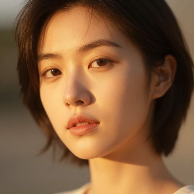 Photograph of a young East Asian woman with short, dark, slightly tousled hair and fair skin. Her face is centered in the frame, showing her delicate features, slightly arched eyebrows, large dark eyes with a subtle, natural makeup look, and full, slightly parted lips with a soft brown hue. The background is a plain, light gray, drawing focus to her face. She has a calm, neutral expression, and the lighting is soft, highlighting her smooth skin texture. She wears a black top, visible at the bottom edge of the frame.