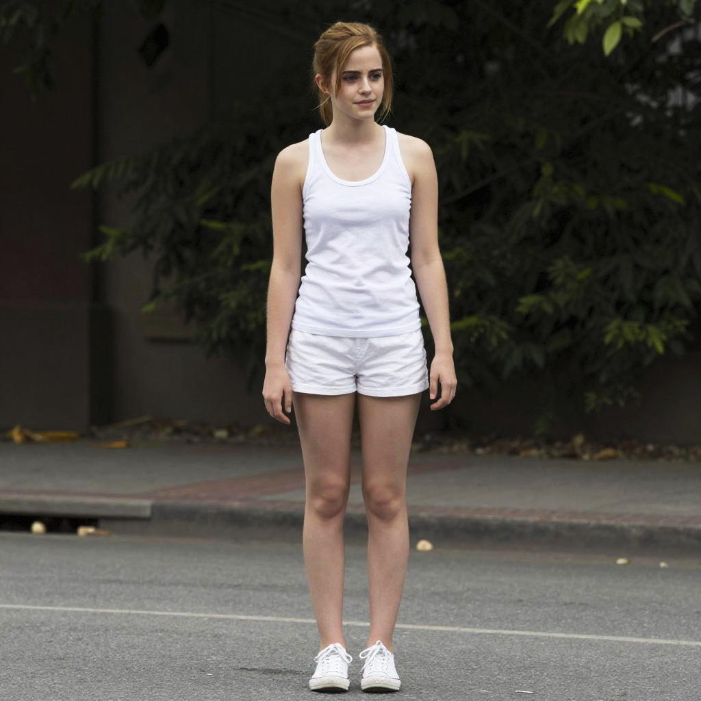 (AS-YoungerV2:1.3), ((emwatz69, accurate face)), 1girl, Emma Watson, queen, pony tail hair, ((full body photo)), photo realistic, high quality, 8k, white tanktop, white shorts