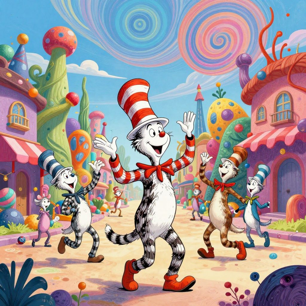 Dr Seuss Whoville characters dancing and singing on winding streets beneath swirling sky patterns, whimsical hats and striped clothing, colorful and surreal backgrounds blending organic and geometric shapes, dynamic movement captured in lively, imaginative style