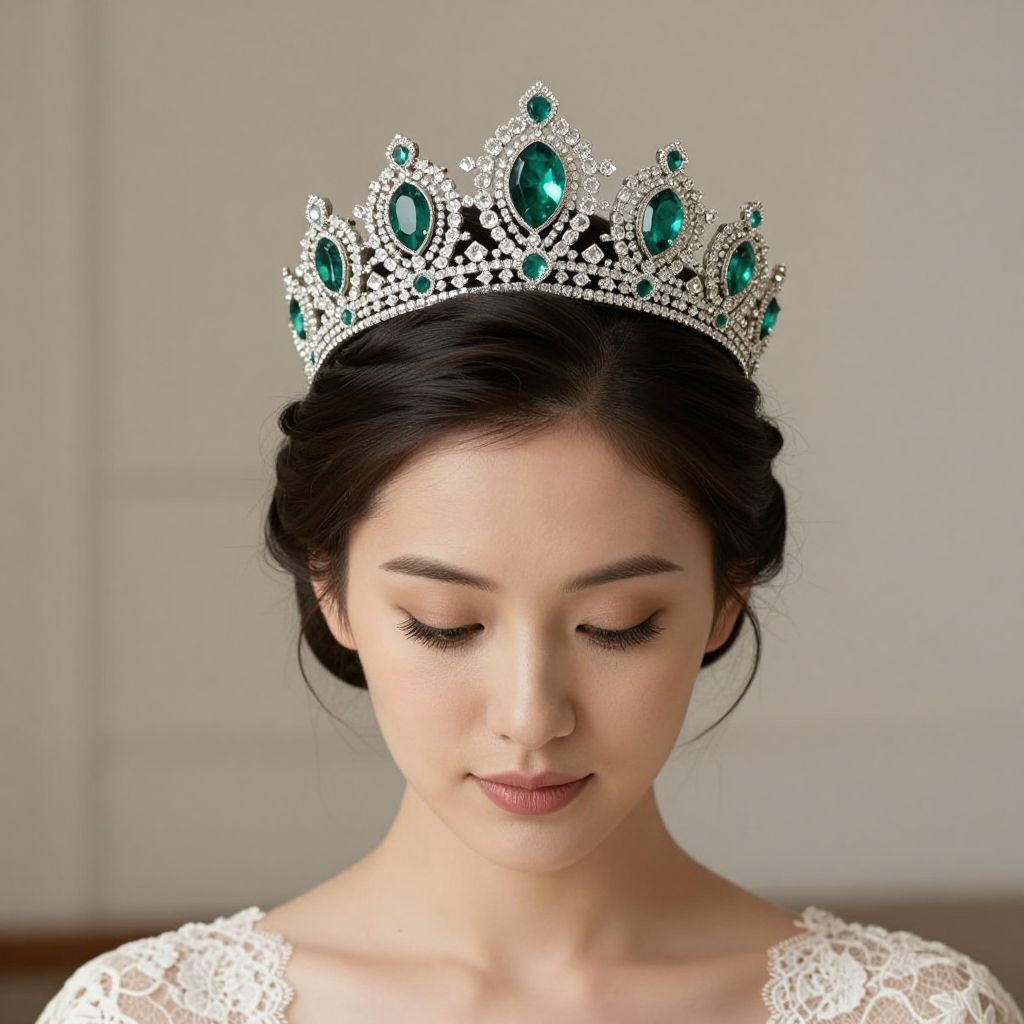 Elegant vintage Baroque-style tiara adorned with imitated emerald crystals and sparkling diamonds rests gracefully atop a woman's neatly styled updo, complementing her bridal attire and delicate lace dress.