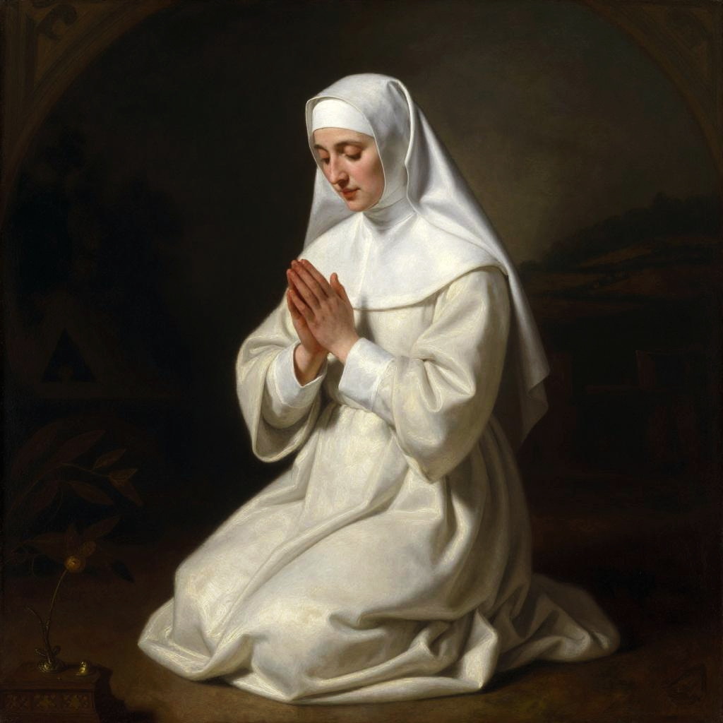 Photorealistic painting of a kneeling nun in white habit, praying with hands together, set against a dark, shadowy background.