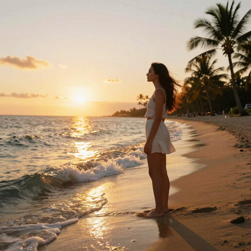 Sunset on a serene beach showing a person bent over in a sleek bikini, warm orange and pink hues filling the sky, calm ocean horizon, soft sand beneath, with gentle breeze moving nearby palm fronds, evoking tranquility and peacefulness.