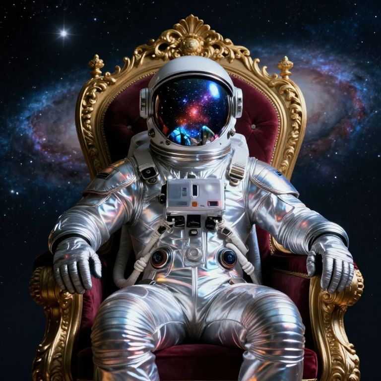 A highly detailed digital artwork featuring a futuristic astronaut seated regally on an opulent throne, blending science fiction with royal grandeur, The astronaut wears a sleek metallic silver suit, its reflective chrome surfaces shimmering with cosmic light, while polished chrome features capture the vibrant hues of the starry backdrop, The helmet's visor is adorned with intricate glittering patterns, reflecting the surrounding stars and nebulae in a dazzling, cosmic display, The reflective surface of the helmet creates a seamless connection between the astronaut and the universe, amplifying their presence, Seated with a contemplative pose, the right hand rests thoughtfully on the chin, while the left rests gracefully on the ornately carved armrest, The throne is a masterpiece, embellished with intricate golden accents and a plush dark red cushion, Its back showcases exquisite filigree details and a luxurious black upholstered seat, Behind the figure, the vast expanse of space unfolds with swirling nebulae, countless stars, and the faint outline of a distant galaxy, evoking a sense of infinite grandeur, The contrast between the throne's opulence, the astronaut's futuristic design, and the cosmic scenery creates a captivating blend of eras and themes, flawless textures, and dramatic, immersive design