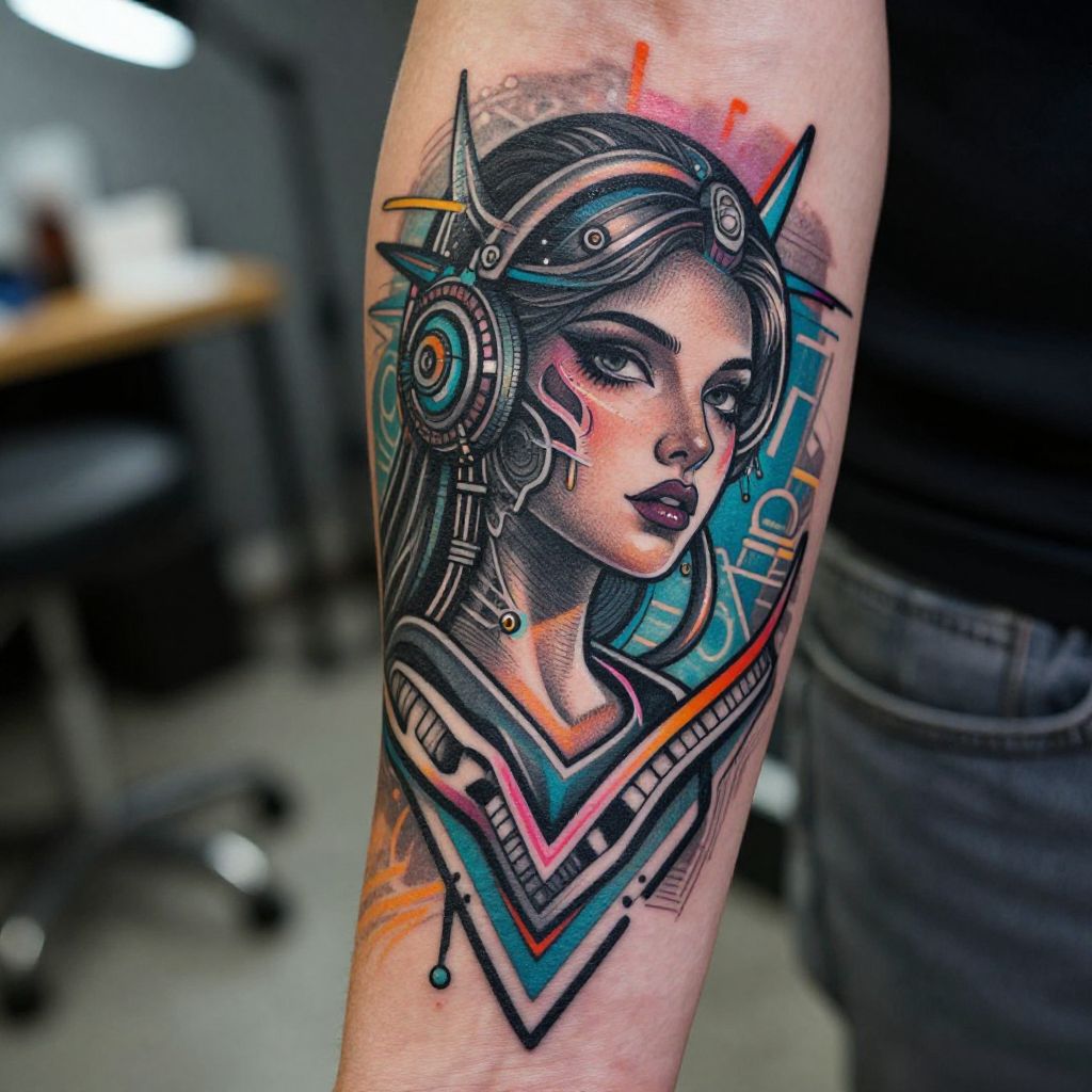 Photograph of a tattoo on a person's forearm, featuring a stylized, cyberpunk woman with dark hair and intricate headgear. She has large, expressive eyes, detailed with bold black and red eyeliner, and wears a futuristic headset. The tattoo is rendered in vibrant colors including blue, orange, and pink, with geometric patterns and lines. The background is slightly blurred, showing an office-like setting with a desk and chair. The tattoo artist's hand is partially visible on the right side of the image. The tattoo combines elements of traditional and digital art styles.