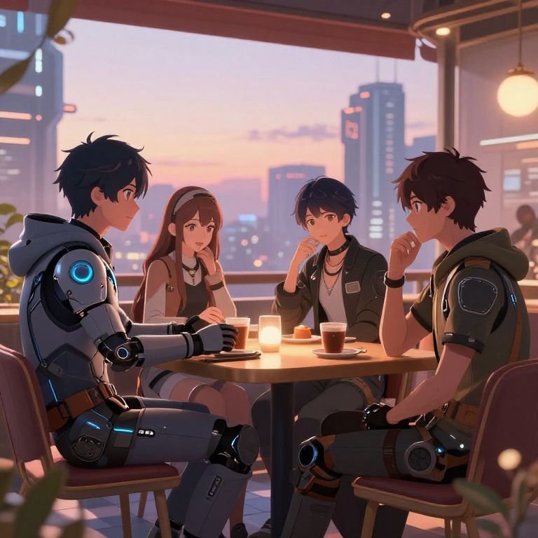 AI anime art portraying a serene moment of a futuristic city café at dusk, with characters wearing advanced tech gear relaxing and interacting, rendered with warm lighting, smooth gradients, and detailed background elements reflecting an anime slice-of-life theme.