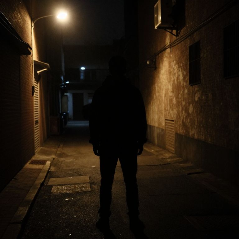 A lone figure standing in a dimly lit alleyway, their silhouette sharply defined against the faint glow of a streetlight, emphasizing the contrast between light and shadow