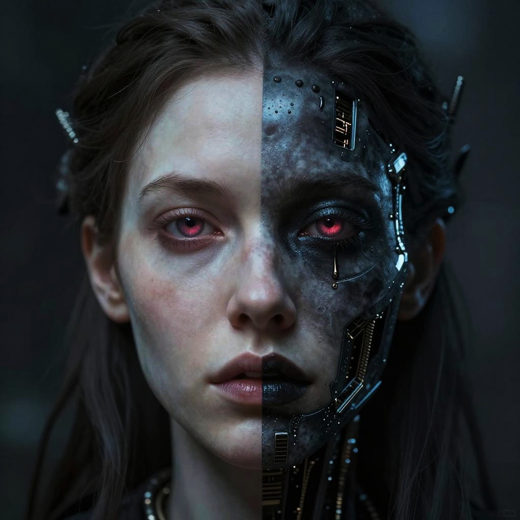 Hyperrealistic art imaginative dark gothic fantasy concept art, bleak, vibrant immersive woman's face split in half, left side is pale skin brightly lit, right side is dark cybernetic, Hyperrealistic art cinematic film still photography in the style of detailed hyperrealism photoshoot . Extremely high-resolution details, photographic, realism pushed to extreme, fine texture, incredibly lifelike