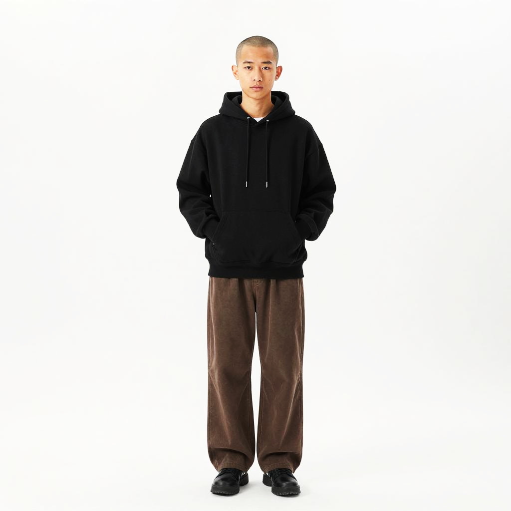 Photograph of a young man standing against a white background. He has a shaved head and is wearing a black hooded sweatshirt with the hood down, and loose, brown cargo pants. His hands are in his pockets, and he's looking slightly to his left with a neutral expression. The image has a clean, minimalistic look, with a slight shadow under him.