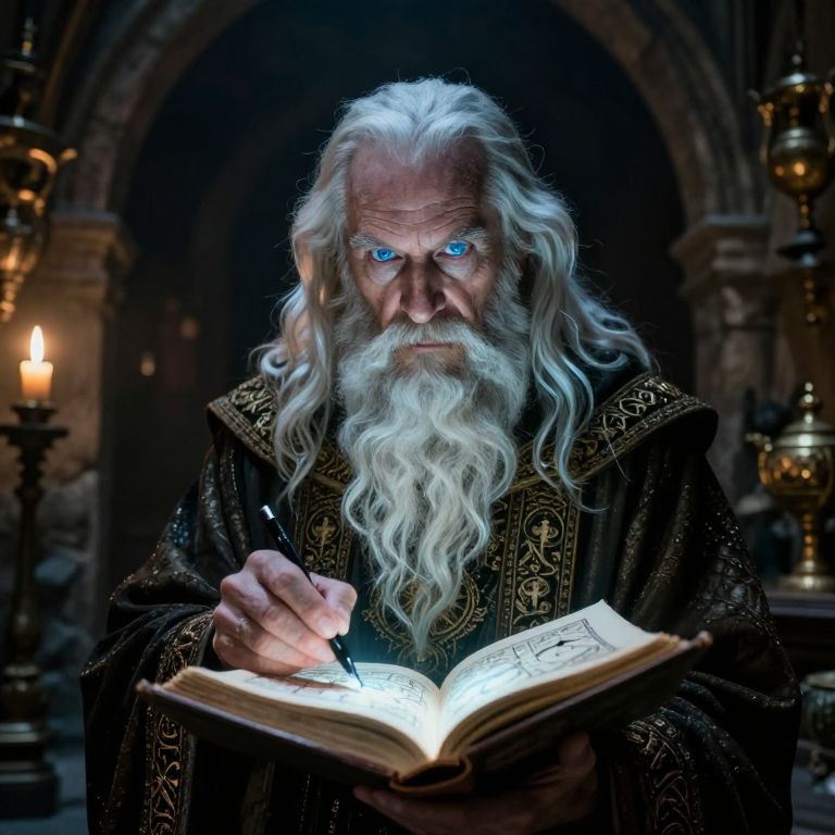 Photograph of an elderly wizard with long white beard, glowing blue eyes, and ornate black robe, writing in a glowing book in a dimly