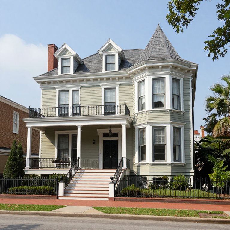 Photograph of a two-story Victorian-style house with light green wooden siding, white trim, and a steep, gabled gray shingle roof. The house features multiple white-framed windows, a small black iron balcony on the second floor, and a larger black iron porch with three steps leading up to the front door. A black iron fence encloses the front yard, which has a red brick walkway. The background shows a clear blue sky, a tree with green leaves, and neighboring brick buildings. The house exudes a classic, historical charm with its intricate architectural details.