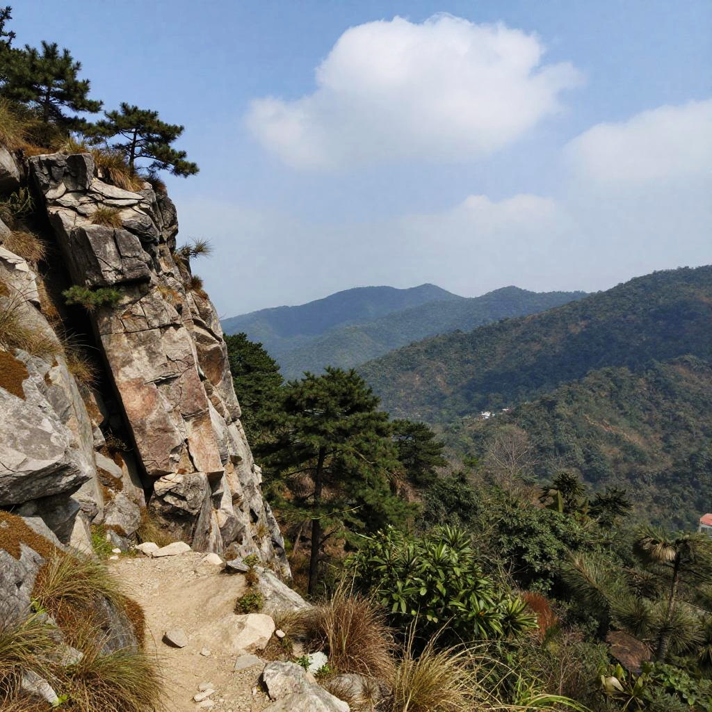Photograph of a mountainous landscape featuring a rocky cliff on the left with jagged, gray and brown rocks, topped by a lone pine tree. A narrow, dirt path winds along the base of the cliff. In the background, rolling green hills and distant blue mountains are visible under a bright, partly cloudy sky. The foreground includes patches of grass and small bushes. The overall scene is sunlit, highlighting the textures of the rocks and foliage.