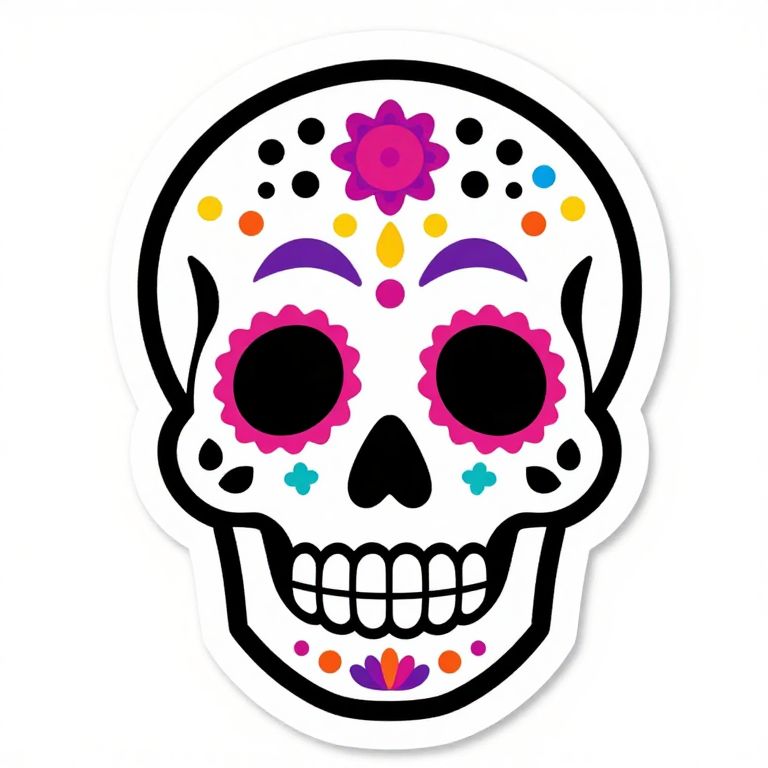 Foreshortening sticker, sugar skull, bright neons, dark blacks, contour, vector, flat white background,