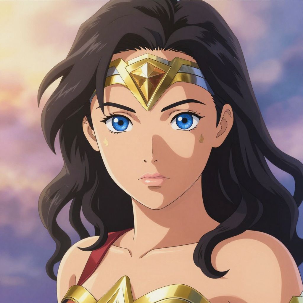 Anime-style drawing of Wonder Woman with blue eyes, long black hair, golden tiara, and armor, against a colorful sky background.