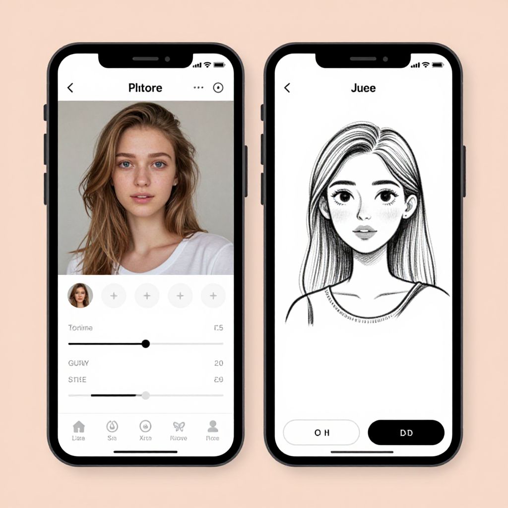 Turn photo into drawing app demo showing side by side original photo and black and white sketch version, interactive touchscreen with sliders and brush options, clean modern design, artistic transformation in progress, pastel background, elegant and user-friendly artistic software