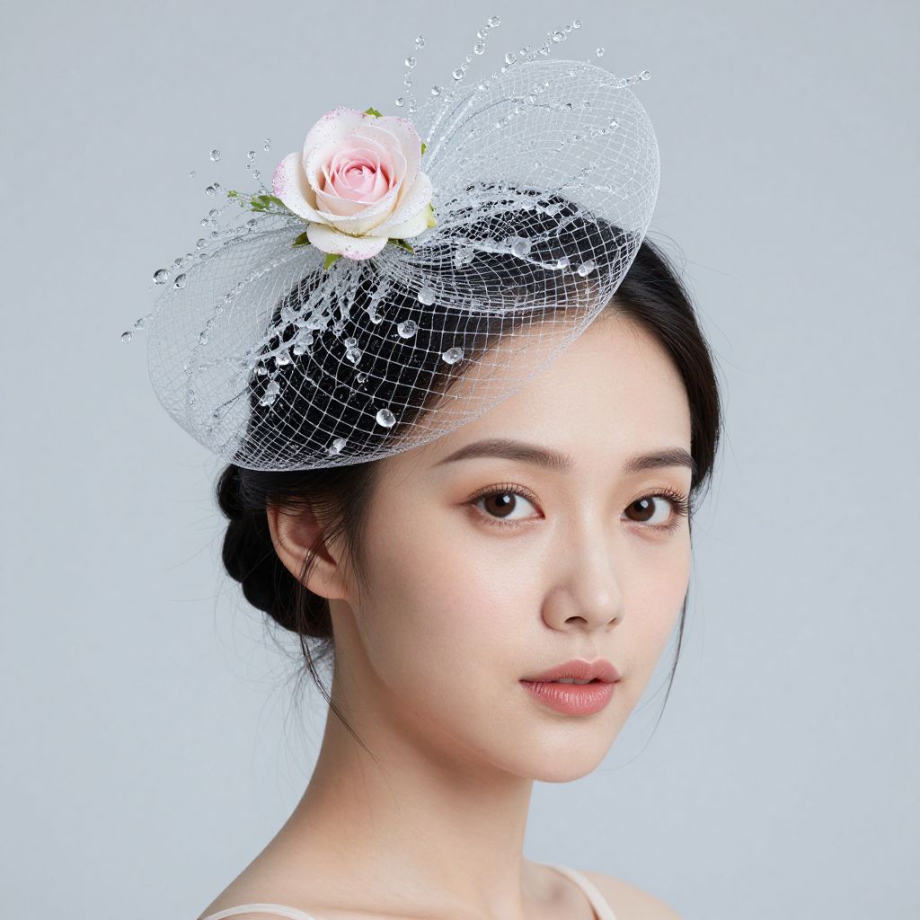 Photograph of an East Asian woman with fair skin, black hair in a bun, wearing a delicate white mesh hat adorned with a pink rose and crystal