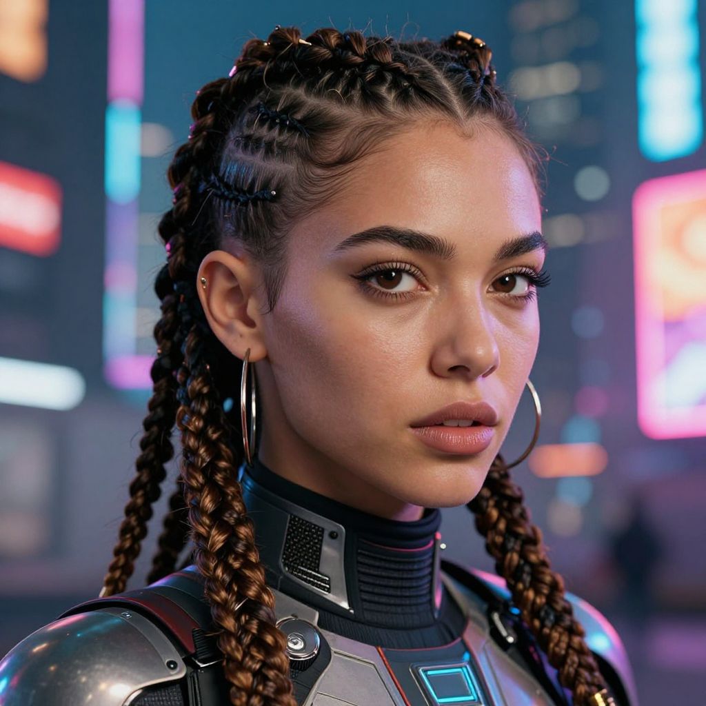 A striking woman with intricate braided hair, undercut hairstyle, and hoop earrings, dressed in a high-collared, futuristic outfit, standing against a vibrant, neon-lit cityscape, ultra-realistic textures, ultra-high definition, photorealistic, highly detailed skin texture, intricate hair braids, detailed lighting, realistic reflections, sharp shadows, dynamic composition, expressive eyes, perfect complexion, vibrant colors, realistic urban background