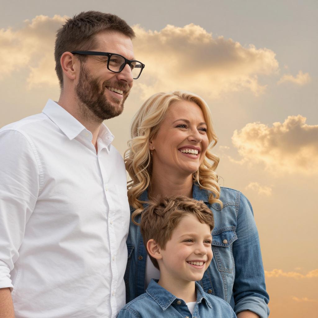 Photograph of a family standing in front of a multi-tiered fountain. Father with glasses and dark hair, smiling, wearing gray shirt and khaki jacket. Mother with blonde hair, beige jacket, holding a book. Son with brown hair, wearing gray shirt and cap, looking at father. Daughter with brown hair, pink headband, denim jacket, looking up at father. Father's arm around mother, mother's arm around daughter. Fountain with cascading water in background. Casual, outdoor setting.
