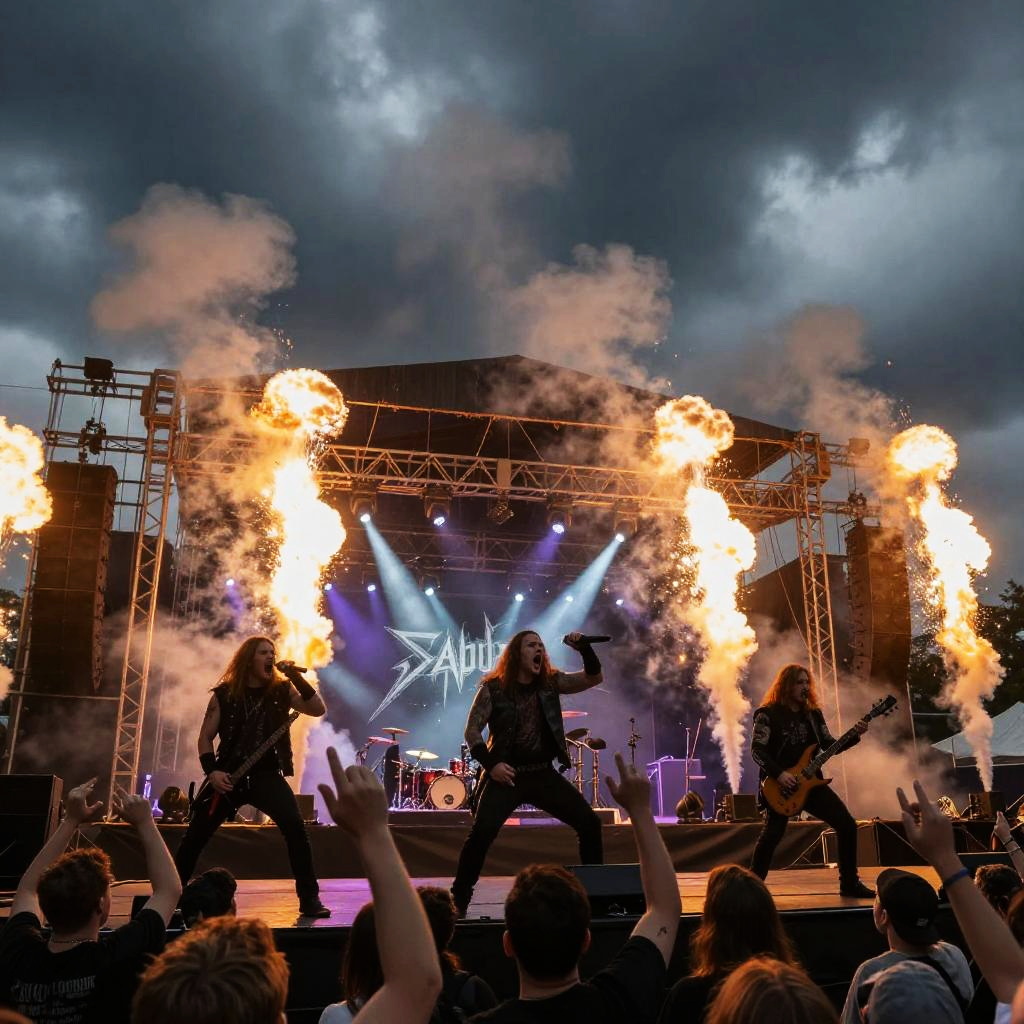 Sabaton inspired heavy metal concert scene, dynamic stage with pyrotechnics, band members performing with intense energy, crowd cheering under a stormy sky backdrop, gritty and dark color scheme, vibrant lighting effects, powerful and electrifying atmosphere.