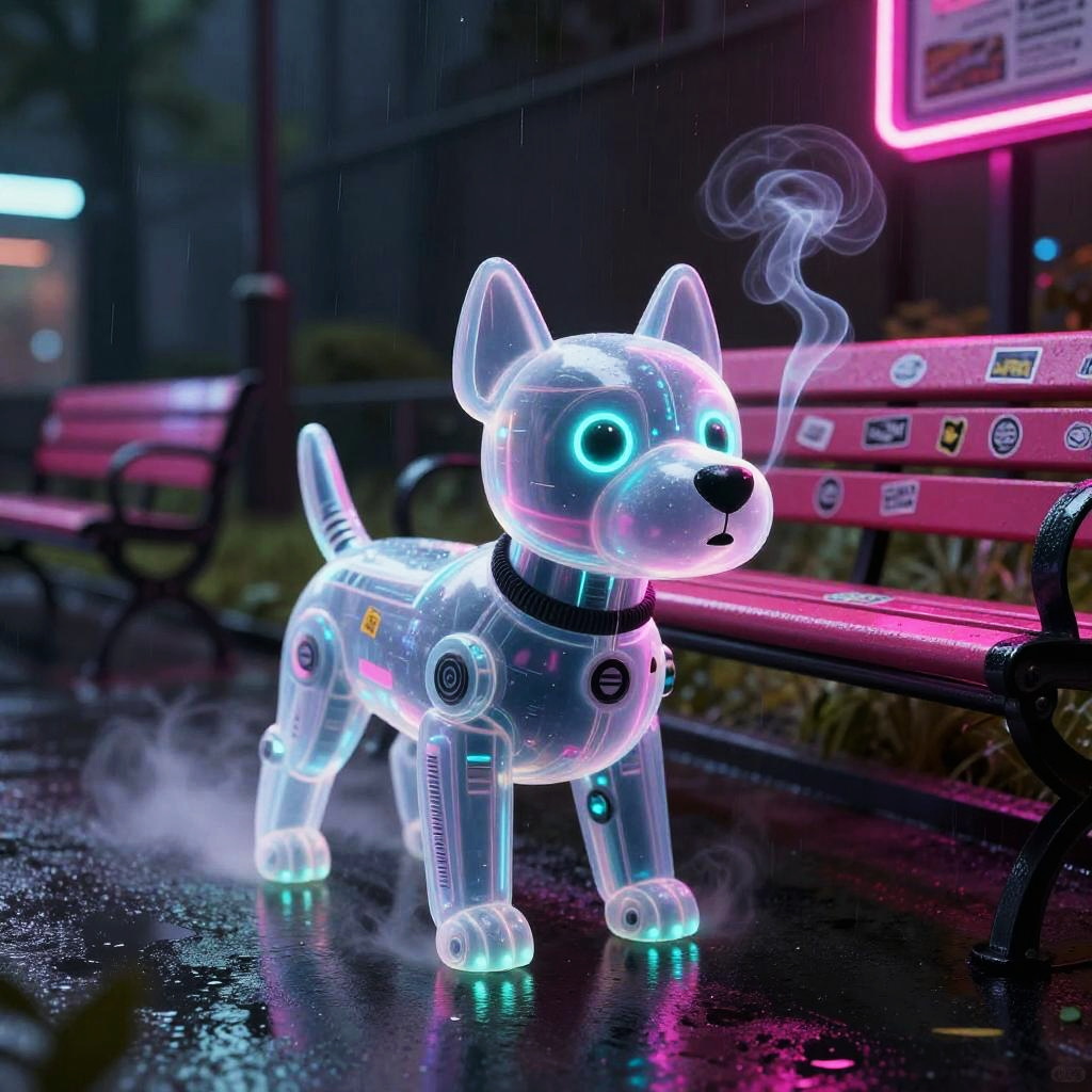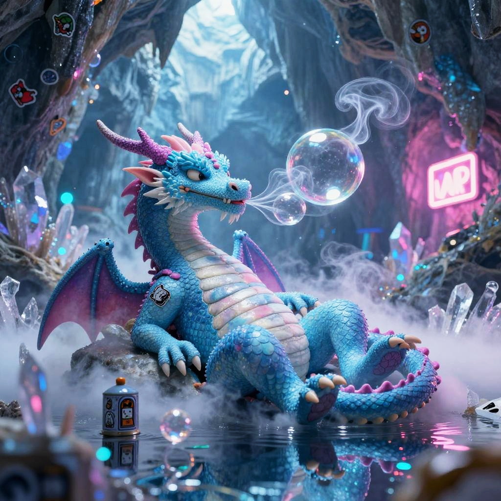 Chill laid-back light blue dragon blowing bubbles in glowing bioluminescent cave with crystal formations and liquid reflections, rendered as dreamy fantasy digital art blending soft pastel watercolor effects and delicate textures; smoke motifs curl into playful patterns, bold magenta-cyan accents with soft volumetric fog, glossy reflections on surfaces, sticker-bombed props and neon signage, subtle chromatic aberration, rim lighting, shallow depth of field bokeh, high-detail textures, dynamic composition, cinematic atmosphere, ultra sharp high resolution