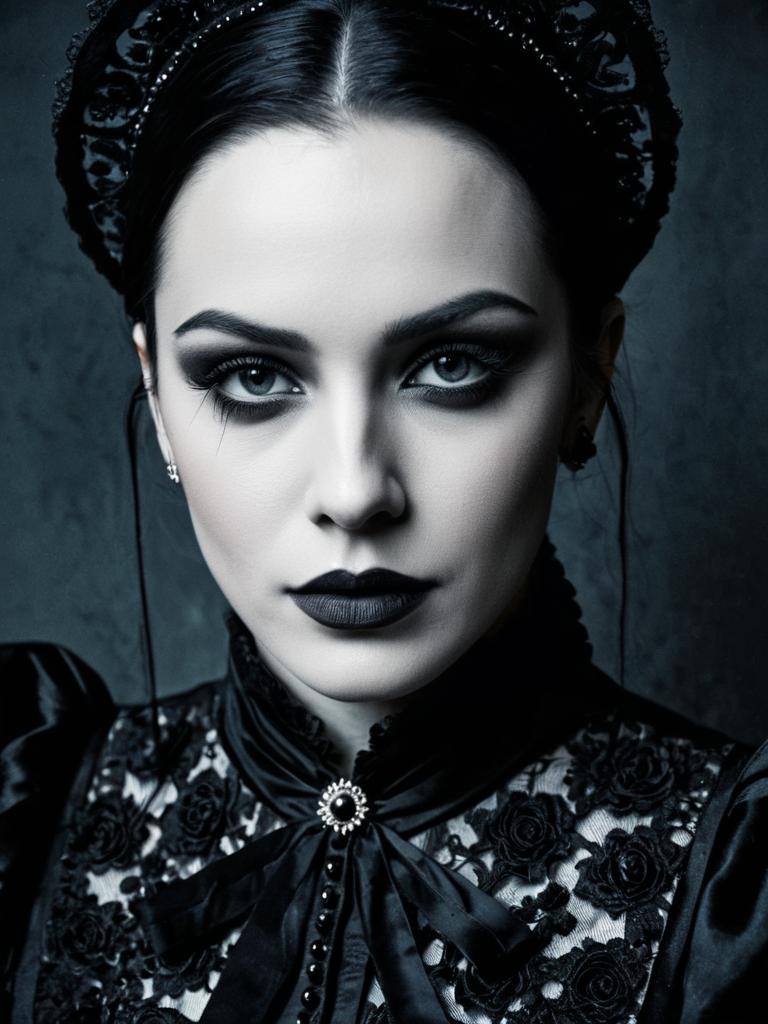 Woman in Gothic Gown, close-up detailed headshot with dramatic makeup
