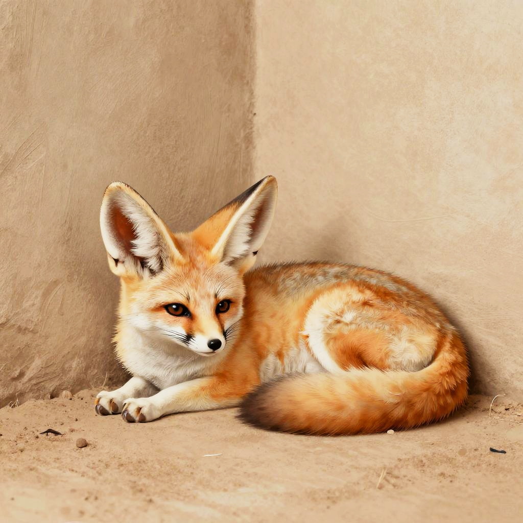 Illustration of a gentle fennec fox, laying in the corner of a wall. Rendered in the style of warm sandy beige and peach, influenced by Konstantinos Parthenis and Louis Majorelle, featuring surreal yet realistic textures and emotional depth.