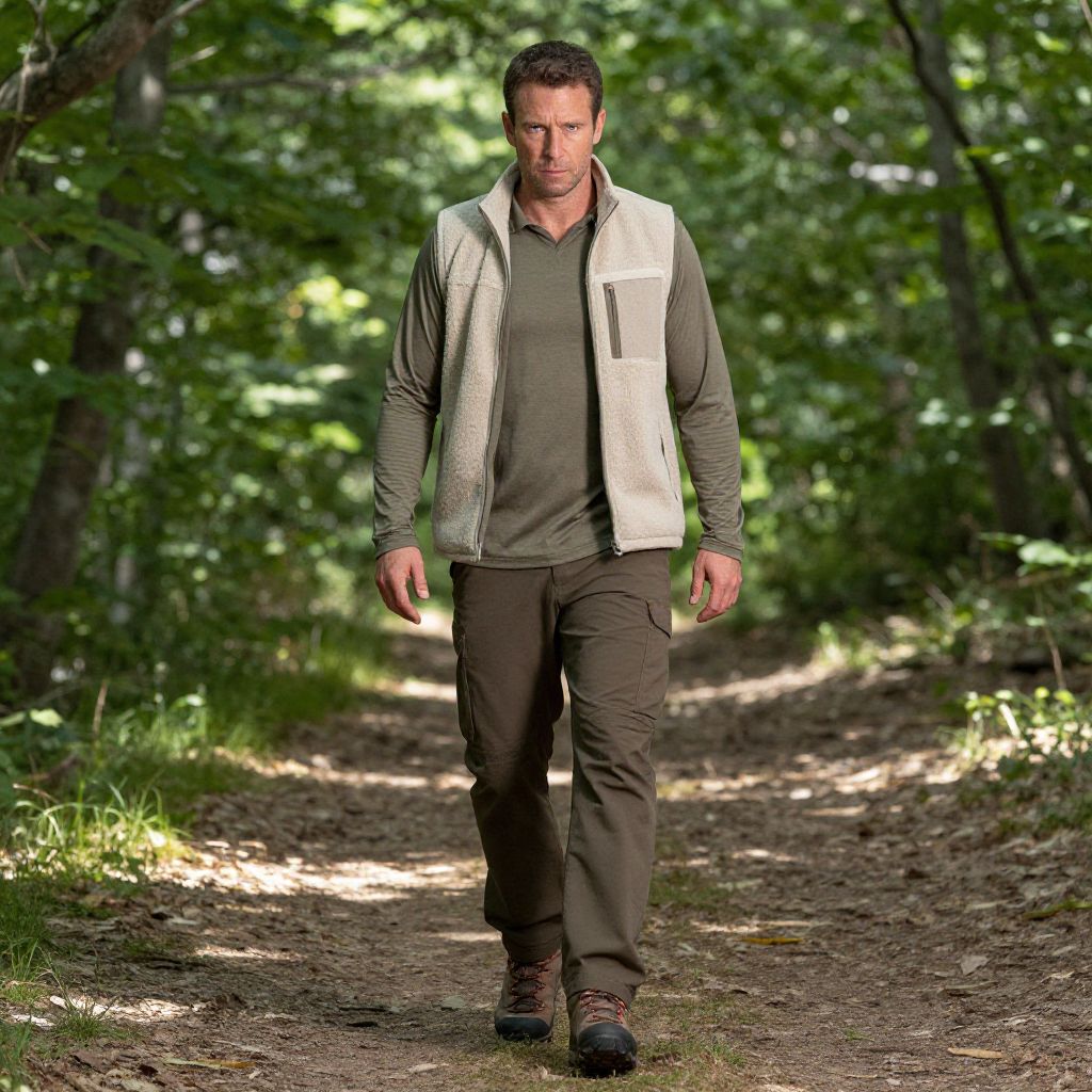 A man, long-sleeve performance shirt, durable hiking pants, rugged hiking boots, lightweight fleece vest, muted greens and browns, lush green canopy, winding dirt path, dappled sunlight filtering through leaves, camera obscura, focused expression, ready for adventure. Man has masculine face and piercing eyes