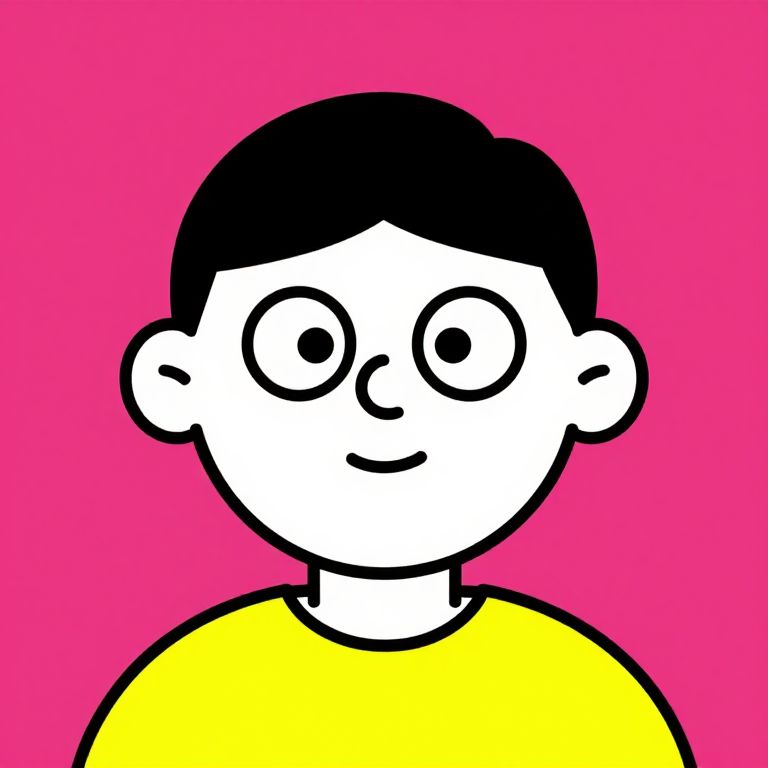 This is a digital cartoon-style drawing of a young boy with a simple, minimalist design. He has black, short, straight hair and large, round, black eyes with small white pupils. His expression is neutral with a small, curved black line for a mouth. He is wearing a bright yellow shirt. The background is a solid, vibrant pink. The boy's face and shirt are outlined in thick black lines, giving the image a bold, graphic appearance. The overall style is reminiscent of children's cartoons with a flat, two-dimensional look.