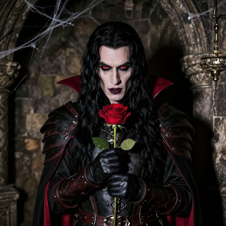 A vampire with long hair in an ancient castle dungeon, crimson eyes piercing the darkness, long black hair cascading over leather armor, holding a blood-red rose, cobwebs and old stone walls in the background, moody and mysterious atmosphere.