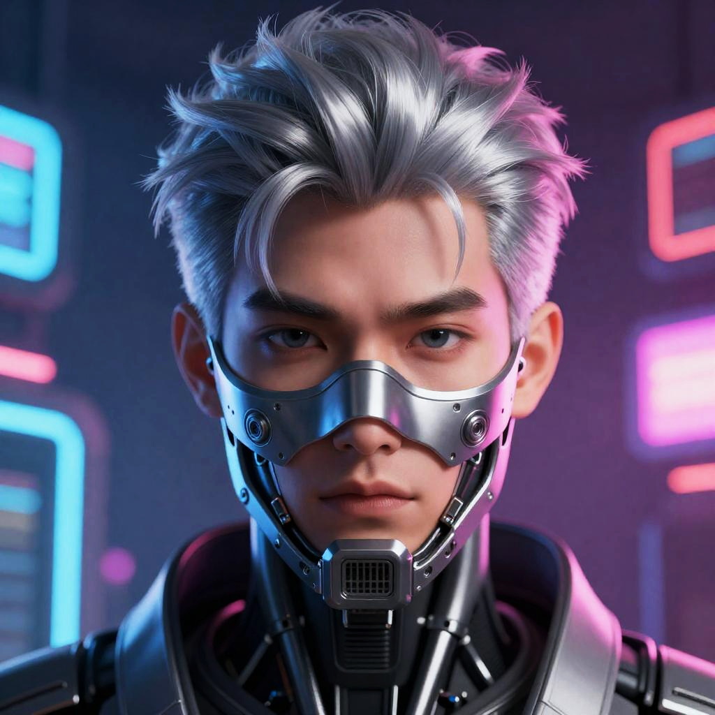 Front-facing portrait of a synthwave spy, with electric indigo metallic details and vivid violet neon eyes, neon grid cityscape background, hyper-realistic with 8k resolution, cinematic lighting, high-tech, Unreal Engine rendering