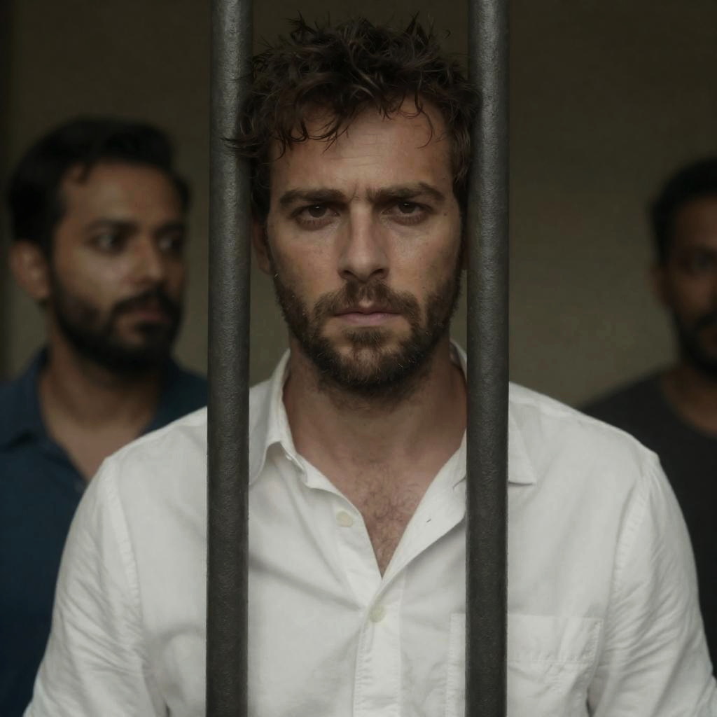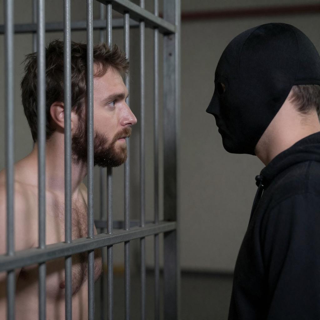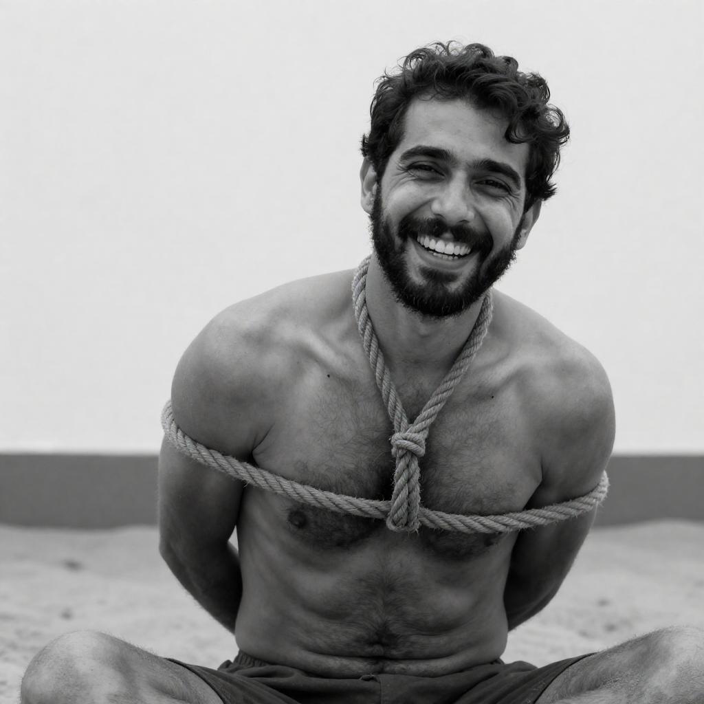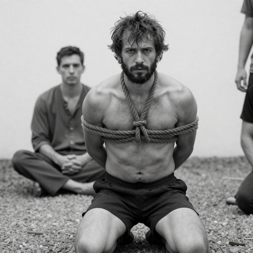 Black and white photograph. Muscular man with messy hair and beard, bound with rope across chest, kneeling in foreground. Second man sits cross-legged in background, wearing loose clothing. Third person's arm visible on right. Gravel ground, plain wall. Intense expressions.