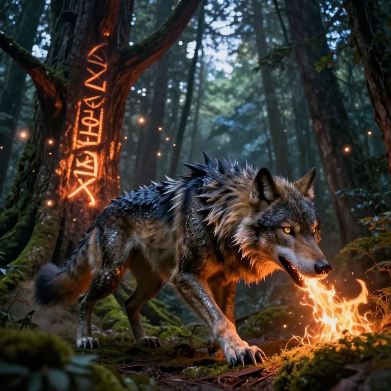 A fantasy dragon wolf hybrid prowling a dense enchanted forest at dusk, its fur and scales blending seamlessly, sharp claws digging into moss, fiery breath illuminating ancient runes carved into vast glowing trees, ethereal lights floating around.