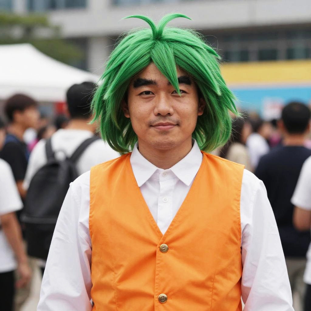 Photograph of an Asian man with green wig, orange vest, white shirt, standing outdoors at a crowded event, background blurred.