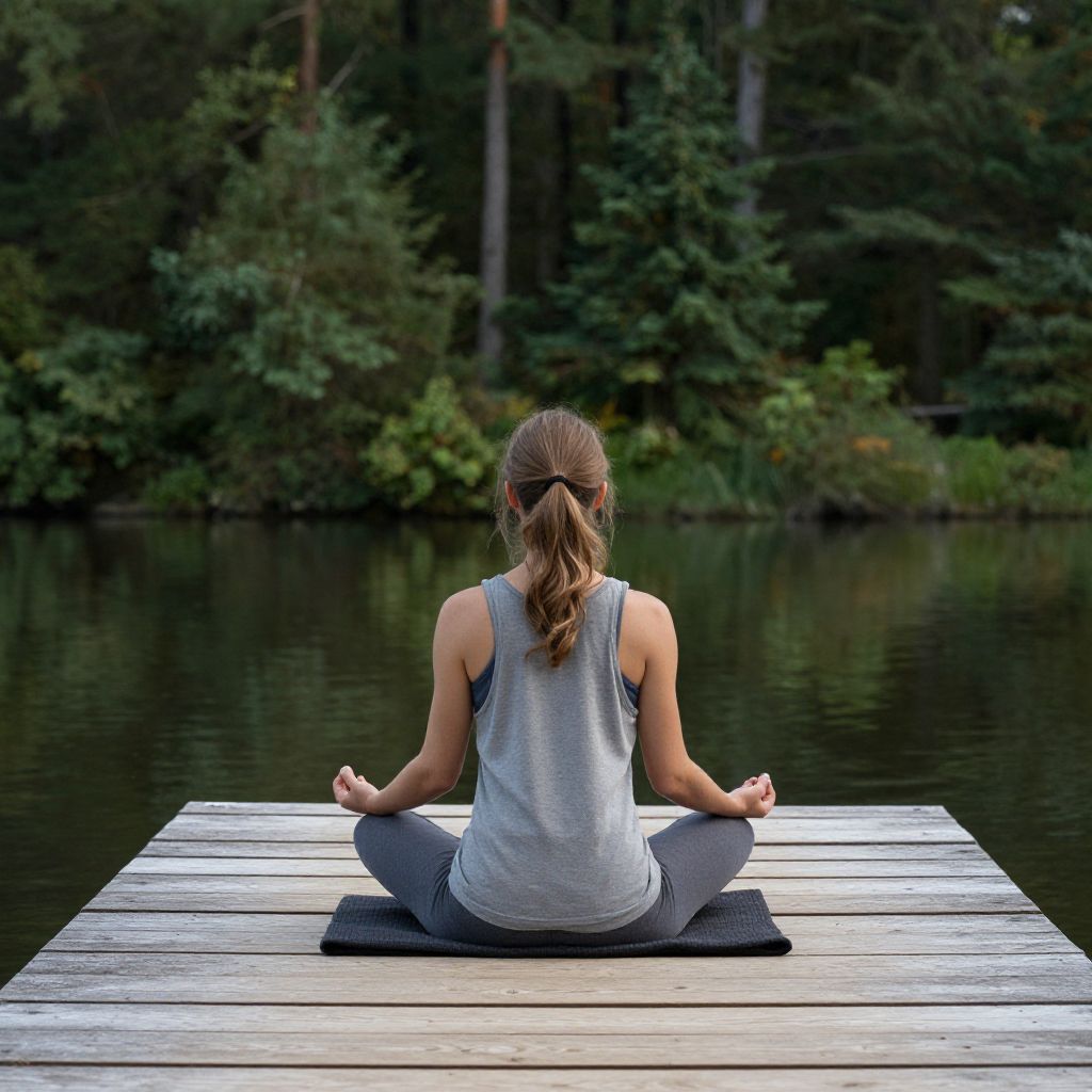 Serenity unfolds as a woman sits in quiet meditation on a wooden pier, her breath mirroring the gentle rhythm of the forest whispers and the stillness of the lake, inviting a profound connection to the timeless embrace of nature.