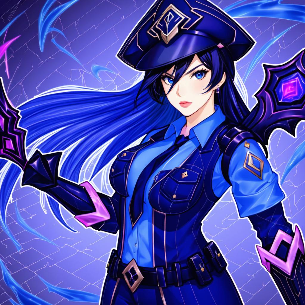 Arcane caitlyn, league of legends, 1girl, blue eyes, long hair, blue hair, black hair, medium breasts, policewoman, by artist usatarou, anime