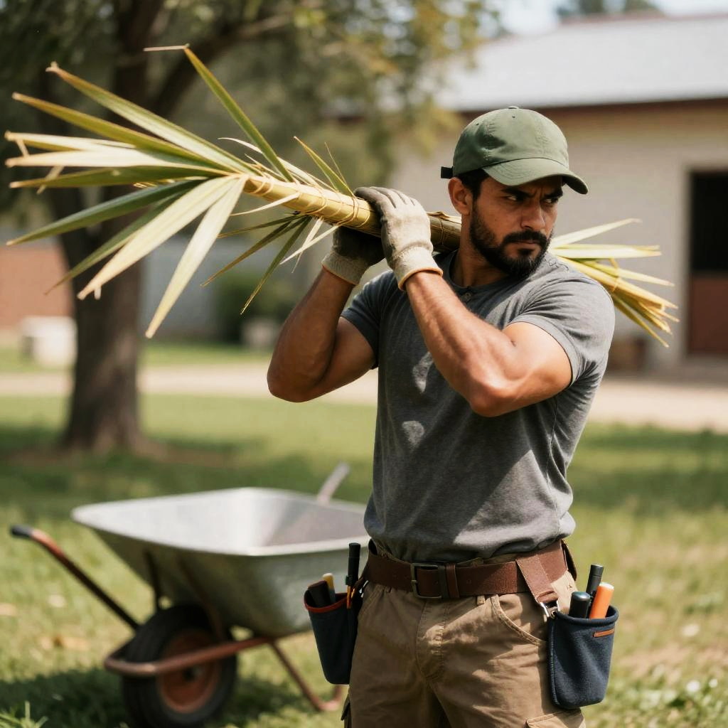 Photograph of a muscular man with a serious expression, wearing a green cap, gray shirt, and gloves, holding a bundle of dried palm leaves over his shoulder. He has a beard and is standing on a grassy yard with a wheelbarrow in the background. Sunlight illuminates the scene. He wears a tool belt with various tools. Palm leaves extend to the left. Background includes a tree and a white building.