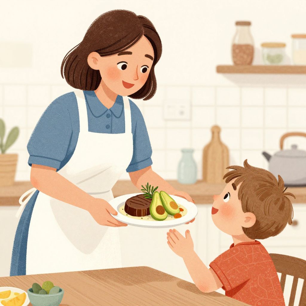 Gretchen Roehrs' illustration depicts a charming scene where a woman stands above a child, both wearing aprons, with the woman presenting a plate of food featuring a piece of meat topped with avocado slices and herbs, while the child gestures towards the dish with a playful expression.
