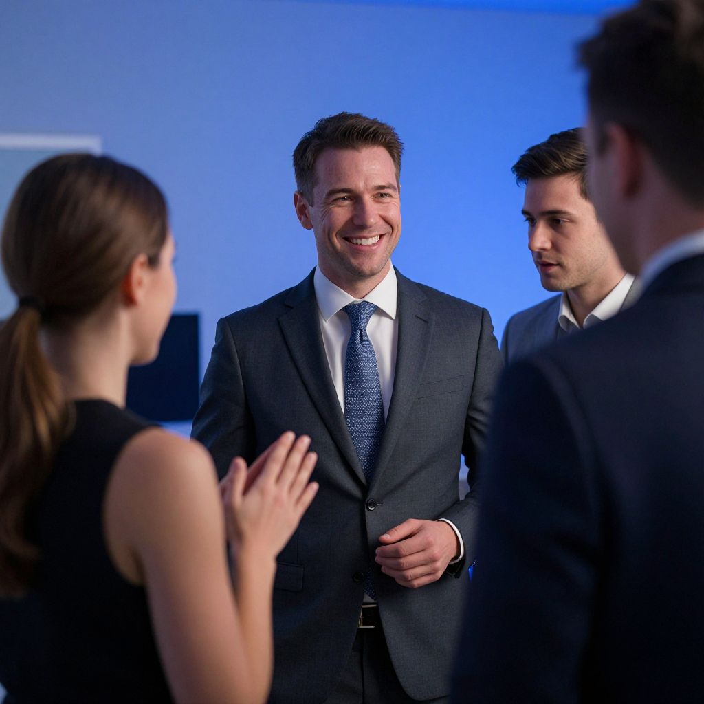 Wet-In-Wet Photography, Photoshoot, Shot on 85mm lens, f1.2, Depth of Field, man supporting people at the office, 40 years, smiling, boss clothes, blue light background,