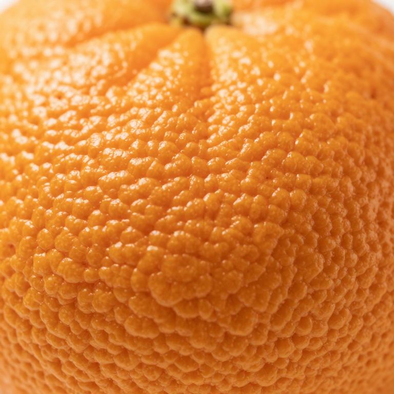 Close-up photograph of a vibrant orange citrus fruit, showcasing its textured, bumpy, and pebbled surface in bright sunlight.