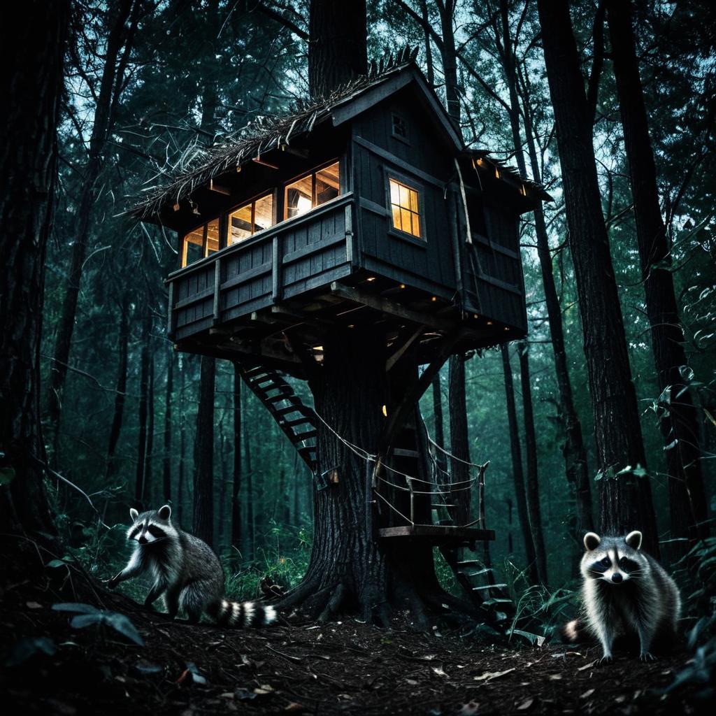 Raccoons breaking into a shed in the city, nighttime scene, mischievous mood, dark lighting, realistic urban background