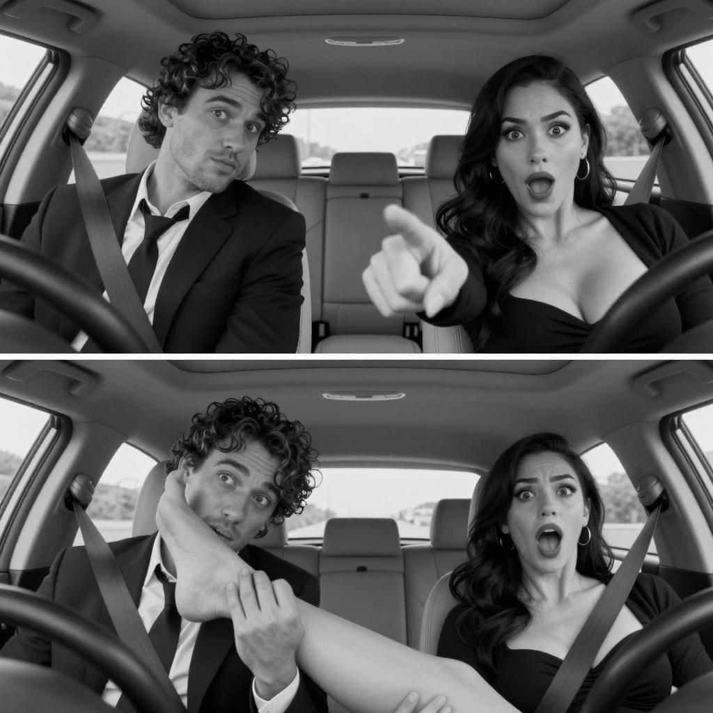 Black-and-white photograph of two people in a car. Top image: man with curly hair in a suit, woman with dark hair, large breasts, and a black top, pointing at the camera. Bottom image: man biting woman's foot, woman's mouth open in surprise. Both wear dark clothing. Car interior with white seats. Man on the left, woman on the right.