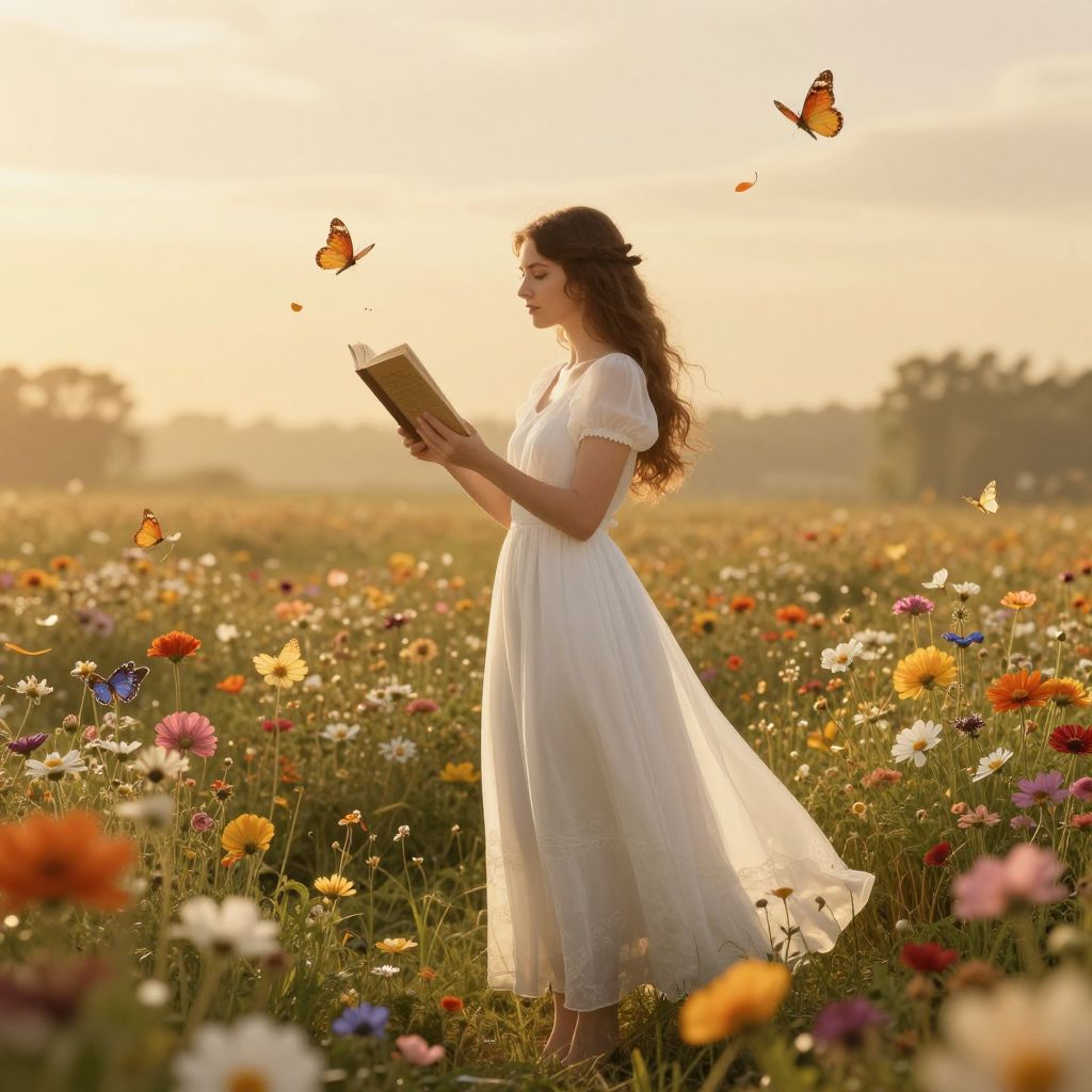 Photograph of a woman in a white, flowing dress reading a book in a sunlit meadow, surrounded by colorful flowers and fluttering butterflies.