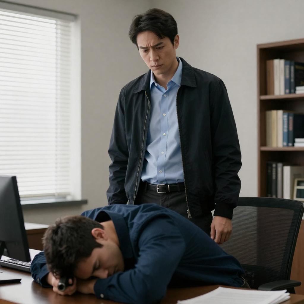 Photograph of a tense scene: a man in a gray suit stands in a doorway, looking down at another man on the floor, who is kneeling and reaching for his black shoes. The room has gray walls, a small window with blinds, and a wooden desk with a lamp in the background.