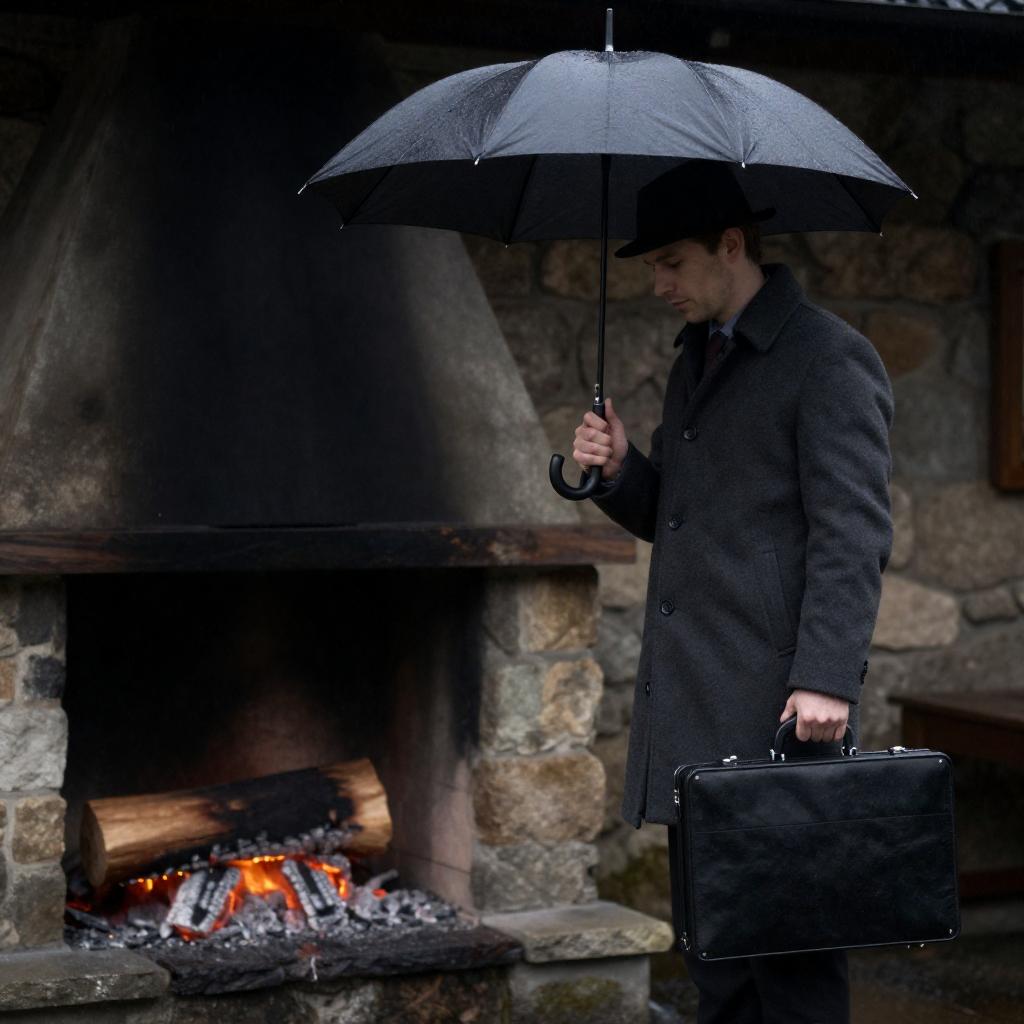 Photograph of a man in a dark gray coat and black hat, holding a black umbrella and a black briefcase, standing in a dimly lit, rustic stone room. He is positioned to the right, with a wooden log and glowing embers on the floor to his left. Raindrops are visible on the umbrella.