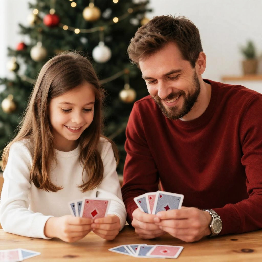 Two children with light brown hair, one girl in red-striped pajamas and one boy in blue and yellow pajamas, play a board game at a wooden table in a cozy living room. Red plush toy on armchair, Christmas decorations in background. Beige armchair in foreground. Warm, festive lighting. Both children smile.
